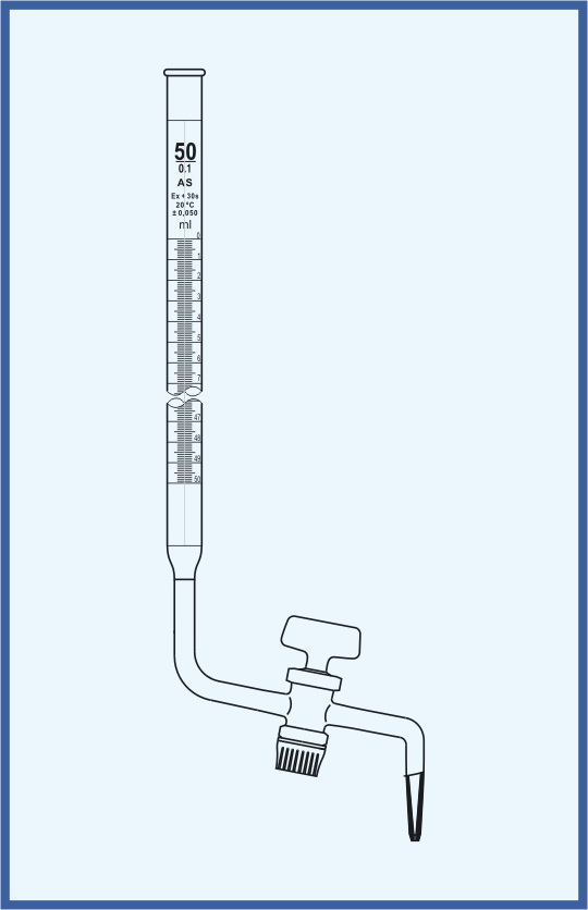 A burette is a volumetric measuring glassware which is used in analytical chemistry for the accurate dispensing of a liquid, especially of one of the reagents in a titration. The burette tube carries graduated marks from which the dispensed volume of the liquid can be determined.
